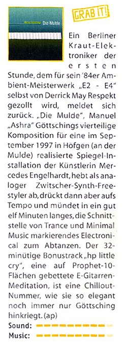 »Die Mulde ist eine über 72minütige CD, deren Hauptteil aus dem 40minütigen Titelstück, das in vier Tracks unterteilt ist, besteht. Aufgenommen wurde die Musik bei einem Konzert, die Manuel am 06.09.1997 in der Denkmalschmiede Höfgen im Rahmen eines Kunstprojektes aufgeführt hat. In der Nähe des Flusses Mulde hatte Mercedes Engelhardt eine Installation von 34 Spiegeln angebracht. Zu diesem imposanten Werk lieferte Manuel seine aus vier Teilen bestehende Suite. Bereits im Jahr 2002 erschien dieser Auftritt auf VHS-Kassette, die Musik wurde in 2005 völlig neu im Studio von Manuel abgemischt und liegt jetzt als CD vor. Wie der Sound zu einem landenden UFO startet Part 1 Schöpferische Stille, das mit knapp drei Minuten der kürzeste Track des Titelstücks ist. Dann kombiniert Manuel beim folgenden Die Mulde diesen Sound mit Phrasen aus sanften Flächen, die sich zu langsamen Melodielinien formen und in einen rhythmischeren Teil übergehen. Den Übergang zu Die Spiegel bildet ein Rhythmusloop, der die Grundlage für diesen Teil darstellt, der sich durch leichte Veränderungen entwickelt. Bis auf das Ende dieses Teils, das durch sehr schöne Rhythmussounds glänzt, ist dieser Teil für meinen Geschmack etwas zu eintönig. Diesen Rhythmus nimmt er dann mit in den nächsten Track Zerfluss rüber, der dann einen industriellen Touch annimmt und dadurch den Hörer in eine Art Trance versetzt. Tolles Teil. Manuel spielt im gesamten Track mit unterschiedlichen Effekten, der Lautstärke, setzt unterschiedliche Rhythmen ein und hält so über die Länge des Stückes die Spannung aufrecht. Als weiteren Titel hat Manuel den Ambienttrack HP Little Cry dem Silberling spendiert. Dieser Track basiert auf einem bereits in den 80er Jahren entstandenen Stück, das Manuel im Jahr 2004 um eine Gitarrenaufnahme anreicherte, so dass ein neuer, bisher unveröffentlichter Track entstand. Auf der recht monotonen Grundfläche spielt Manuel eine recht experimentell angelegte Gitarre.« |